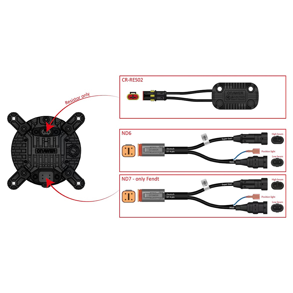 Der CRAWER Hyperios 90 mm LED-Scheinwerfer mit HALO ist auch mit den passenden Adapterkabeln ND6 hier erhältlich.
